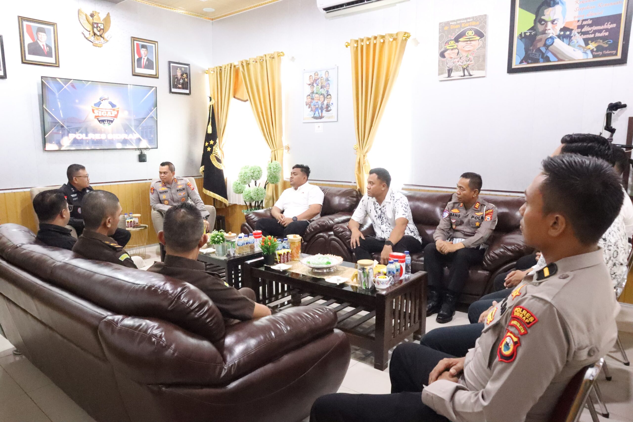 Kepala Kepolisian Resor Sidrap Akbp Fantry Taherong menerima kunjungan audience Kepala Kejaksaan Negeri Kabupaten Sidrap Bapak Adhy Kusumo Wibowo bersama rombongan, kegiatan berlangsung di ruang Kerja Kapolres Sidrap, Selasa (11/11/25) pagi
